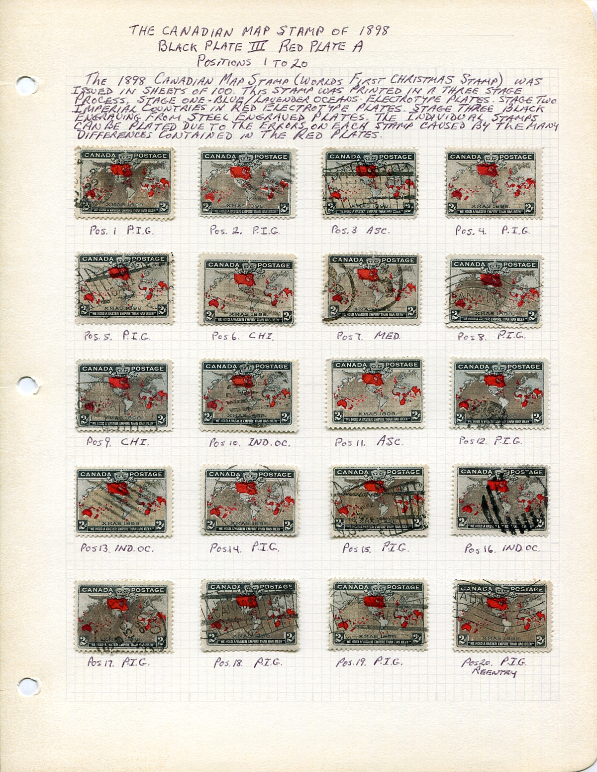 Plating Study. A used plate position study of the 1898 "Map Stamp", still mounted on the original owner's pages, and purportedly complete for all 100 positions of Black Plate III, Red Plate A. All with oxidized "muddy water" oceans. Estimate =