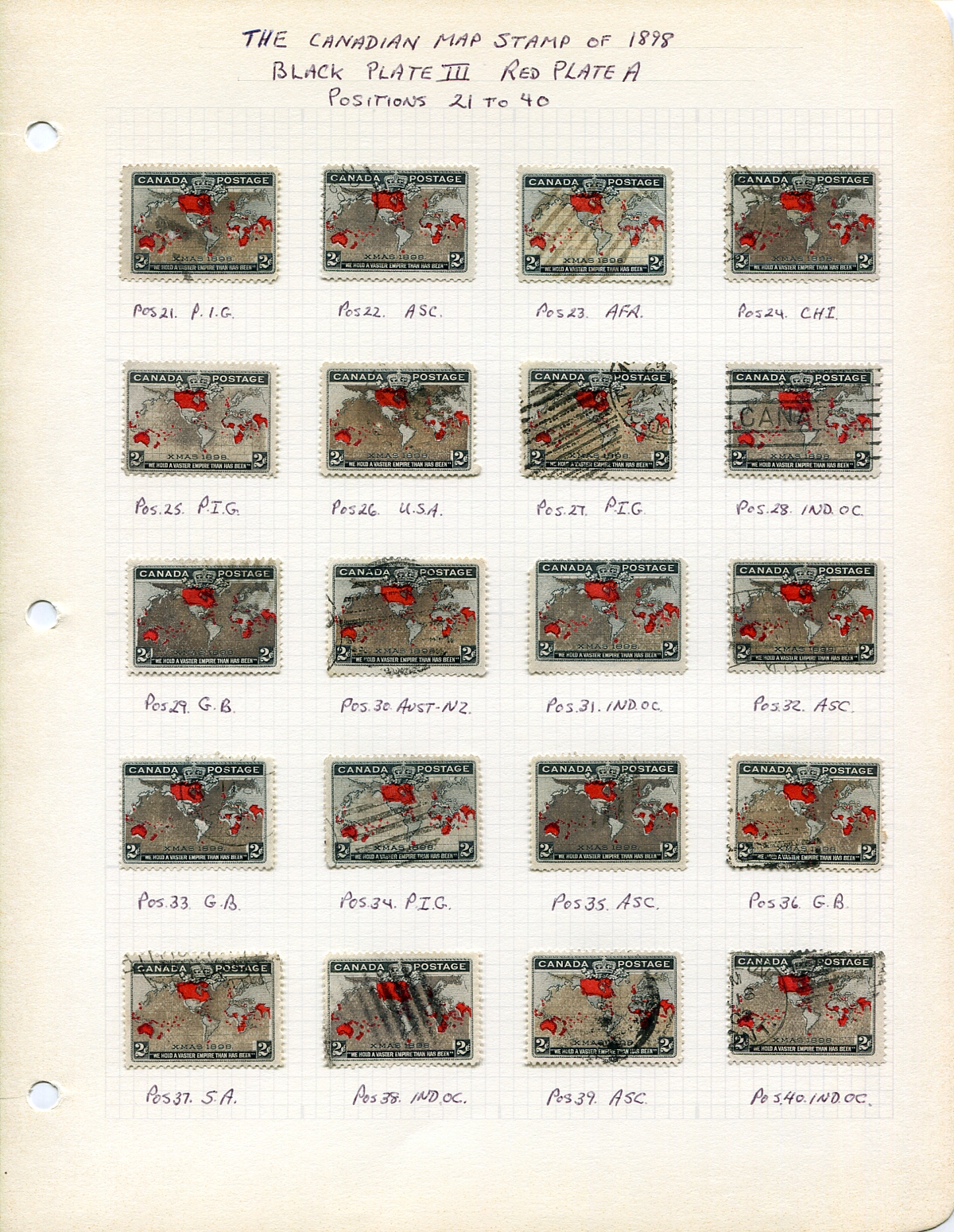 Plating Study. A used plate position study of the 1898 "Map Stamp", still mounted on the original owner's pages, and purportedly complete for all 100 positions of Black Plate III, Red Plate A. All with oxidized "muddy water" oceans. Estimate =