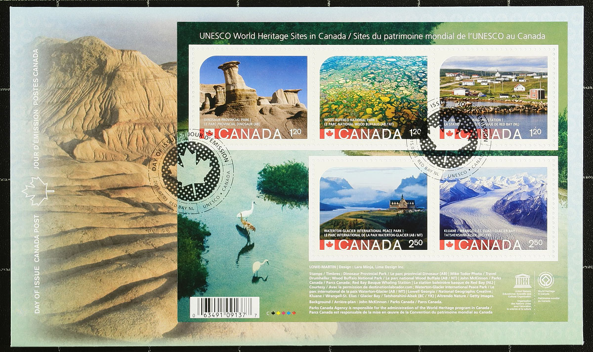 First Day Cover. Extremely rare duo of private cachet "UNESCO" First Day Covers of the recalled 2015 issue "Wrong Hoodoo" $8.60 souvenir sheet containing one $1.20 "Wrong Hoodoo" stamp (#2844a) and the set of singles from the booklet (#2845-2849). Cancelled with the official "Maple Leaf" illustrated Red Bay, NFLD postmark. Unitrade catalogues the Canada Post FDC for the souvenir sheet alone at $650.00! Estimate =