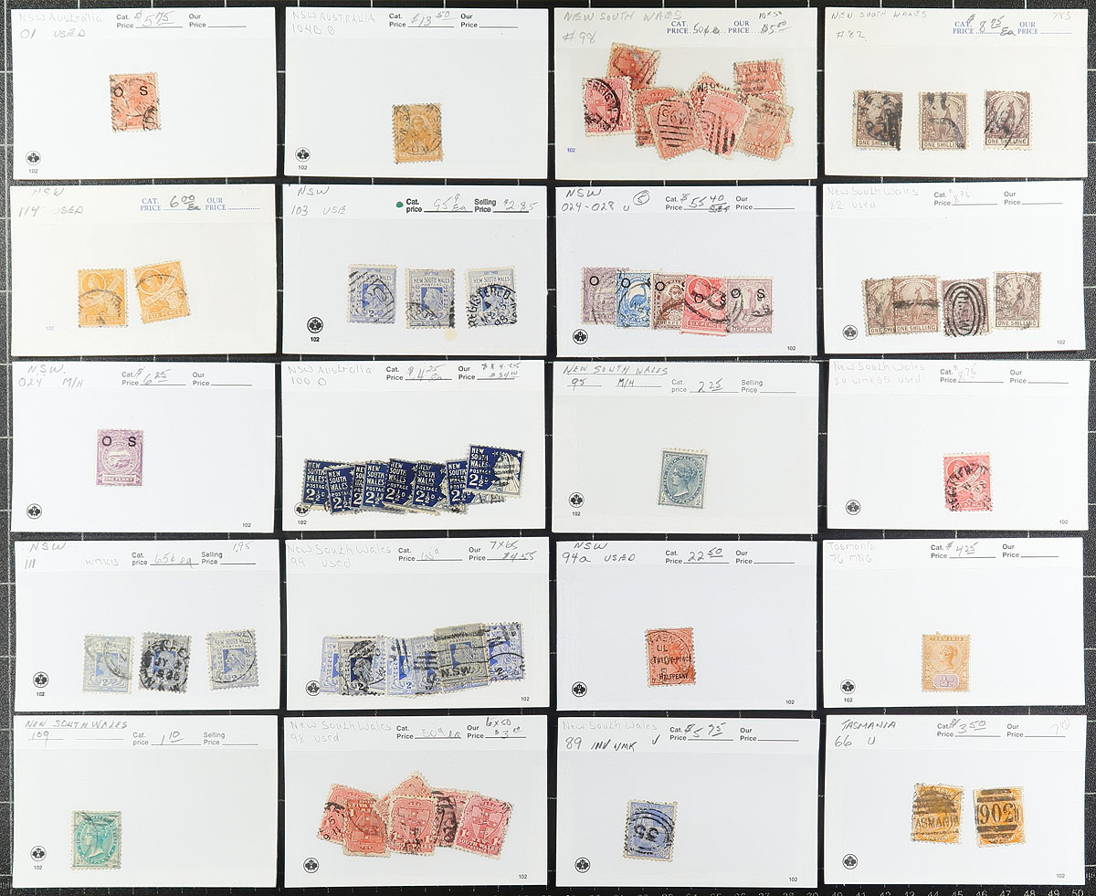 Group of mint and used Australian States in roughly 125 dealer 102 cards. A spot check indicated better representation from Queensland, Tasmania, and New South Wales, with generally one stamp per card. All the stamps have been identified using Scott numbers with older retail prices attached, generally ranging from $3 to $15 each, including officials and postage due stamps, along with regular issues. Some of the material has faults, still a nice grouping for the Australia or Commonwealth collector. Estimate =
