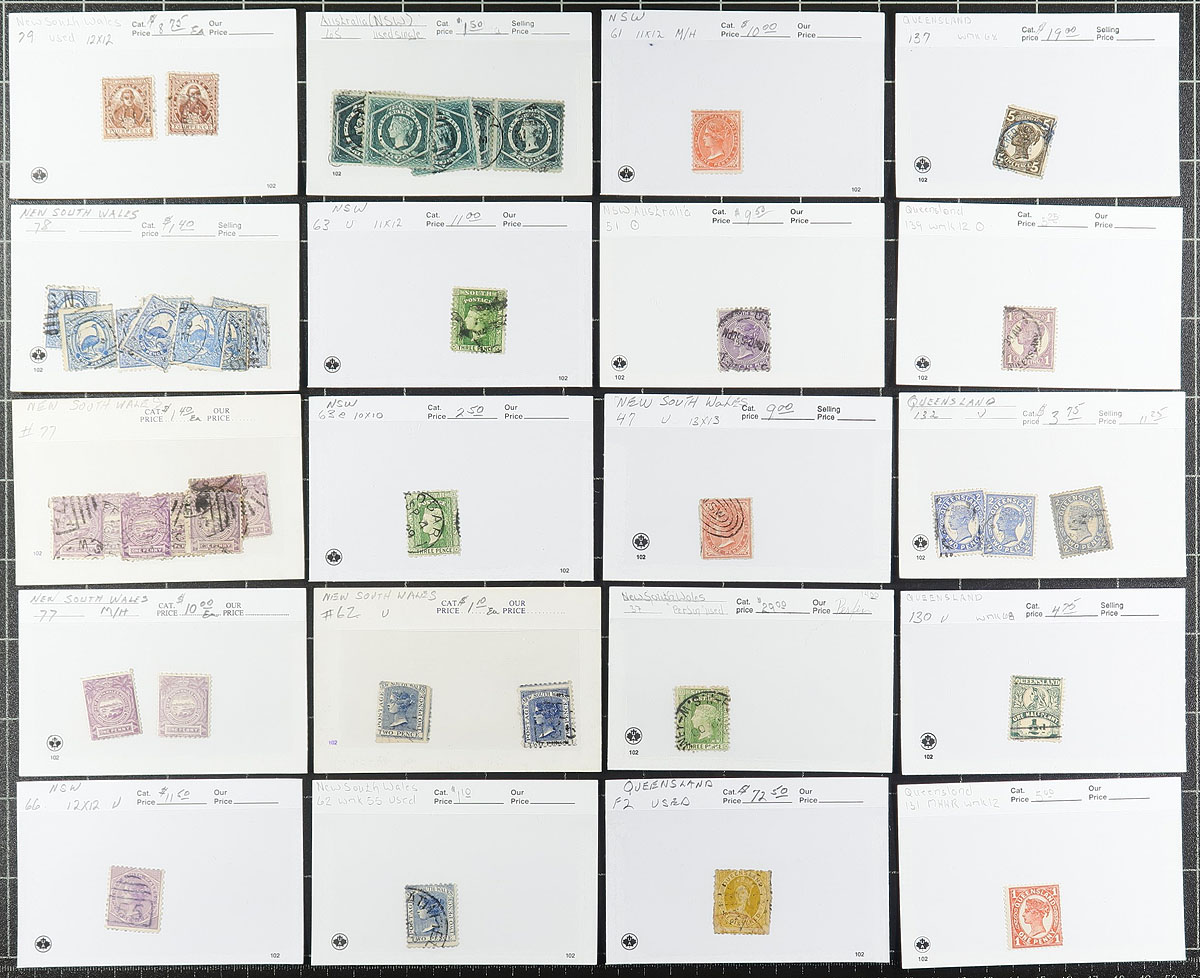 Group of mint and used Australian States in roughly 125 dealer 102 cards. A spot check indicated better representation from Queensland, Tasmania, and New South Wales, with generally one stamp per card. All the stamps have been identified using Scott numbers with older retail prices attached, generally ranging from $3 to $15 each, including officials and postage due stamps, along with regular issues. Some of the material has faults, still a nice grouping for the Australia or Commonwealth collector. Estimate =