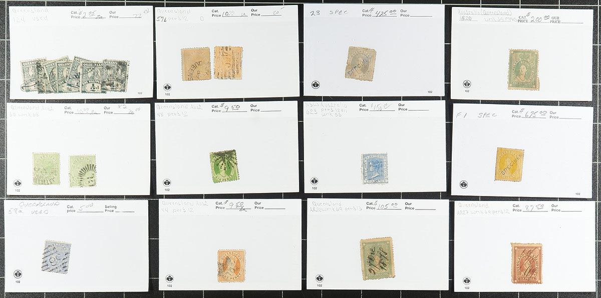 Group of mint and used Australian States in roughly 125 dealer 102 cards. A spot check indicated better representation from Queensland, Tasmania, and New South Wales, with generally one stamp per card. All the stamps have been identified using Scott numbers with older retail prices attached, generally ranging from $3 to $15 each, including officials and postage due stamps, along with regular issues. Some of the material has faults, still a nice grouping for the Australia or Commonwealth collector. Estimate =