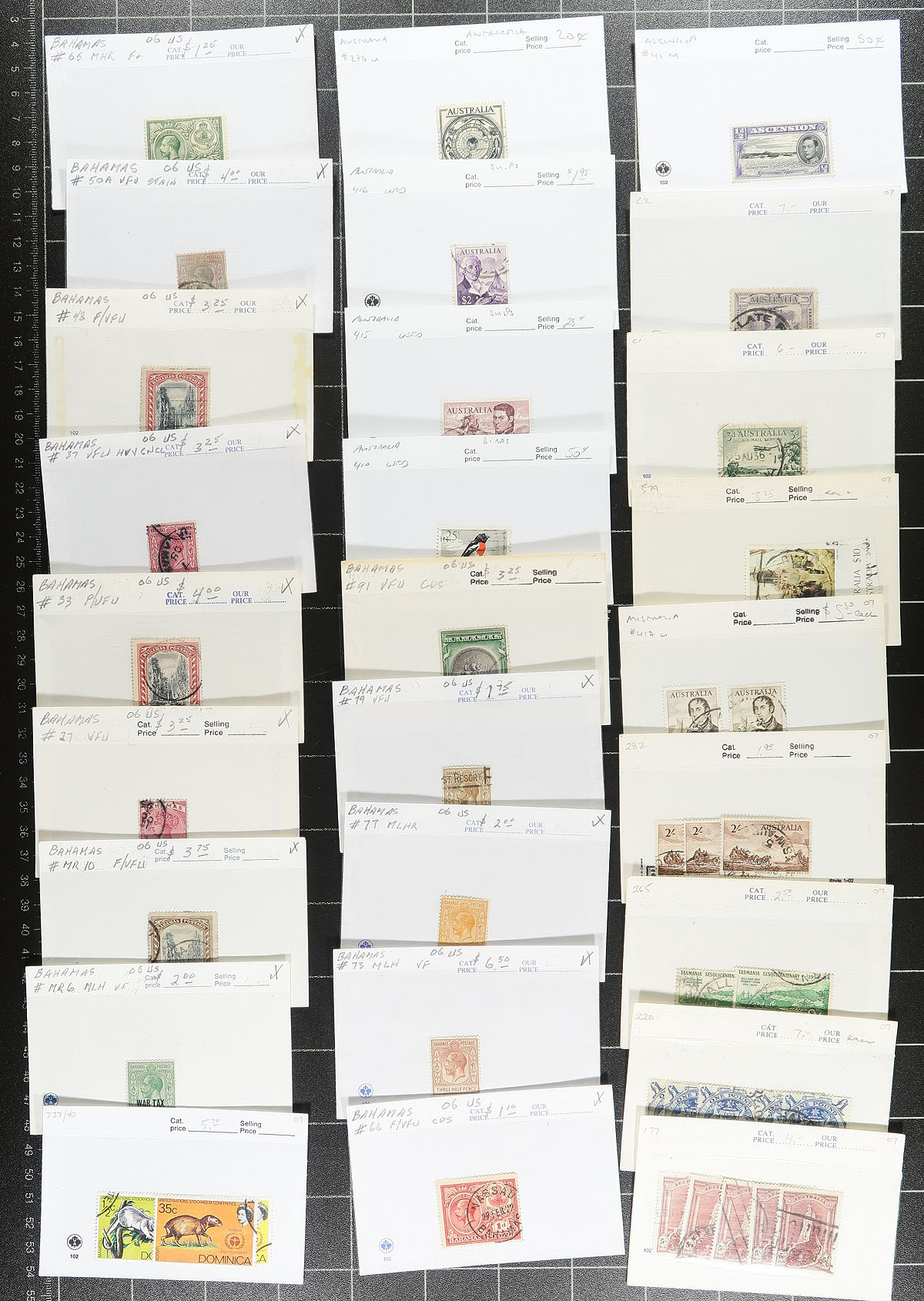 Group of primarily used British Commonwealth stamps in roughly 175 dealer 102 cards, Victorian reign to the 1960's. The lot contains material from countries A to D, noting better representation from Bahamas, Cyprus, Ceylon, with each stamp identified by Scott number with accompanying older catalogue price. Most cards have one stamp per card, along with a few sets, generally cataloging $3 and under, but did note better items cataloguing $5 to $20 and up each. Owner's older Scott value for the lot totals US$1,113.87 ($1503.75). A few faults noted, still a nice lot for the British Commonwealth or worldwide collector. Estimate =