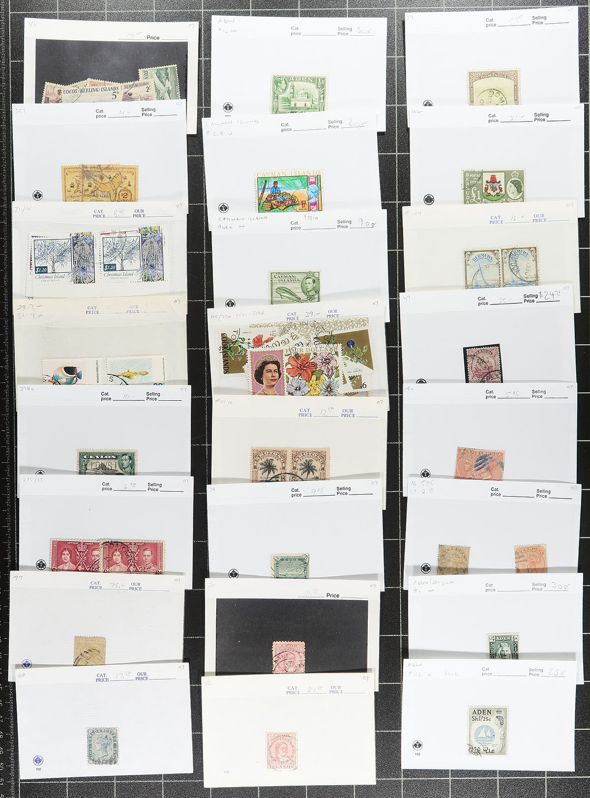 Group of primarily used British Commonwealth stamps in roughly 175 dealer 102 cards, Victorian reign to the 1960's. The lot contains material from countries A to D, noting better representation from Bahamas, Cyprus, Ceylon, with each stamp identified by Scott number with accompanying older catalogue price. Most cards have one stamp per card, along with a few sets, generally cataloging $3 and under, but did note better items cataloguing $5 to $20 and up each. Owner's older Scott value for the lot totals US$1,113.87 ($1503.75). A few faults noted, still a nice lot for the British Commonwealth or worldwide collector. Estimate =