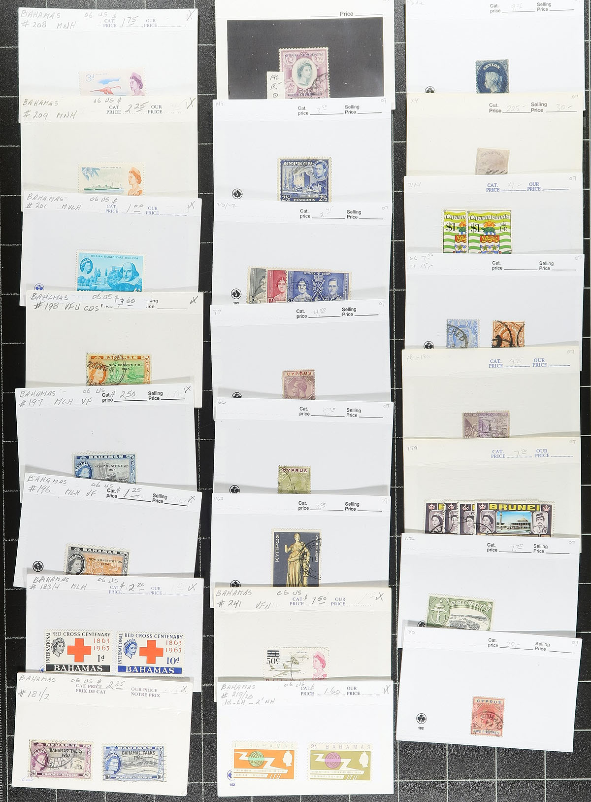 Group of primarily used British Commonwealth stamps in roughly 175 dealer 102 cards, Victorian reign to the 1960's. The lot contains material from countries A to D, noting better representation from Bahamas, Cyprus, Ceylon, with each stamp identified by Scott number with accompanying older catalogue price. Most cards have one stamp per card, along with a few sets, generally cataloging $3 and under, but did note better items cataloguing $5 to $20 and up each. Owner's older Scott value for the lot totals US$1,113.87 ($1503.75). A few faults noted, still a nice lot for the British Commonwealth or worldwide collector. Estimate =