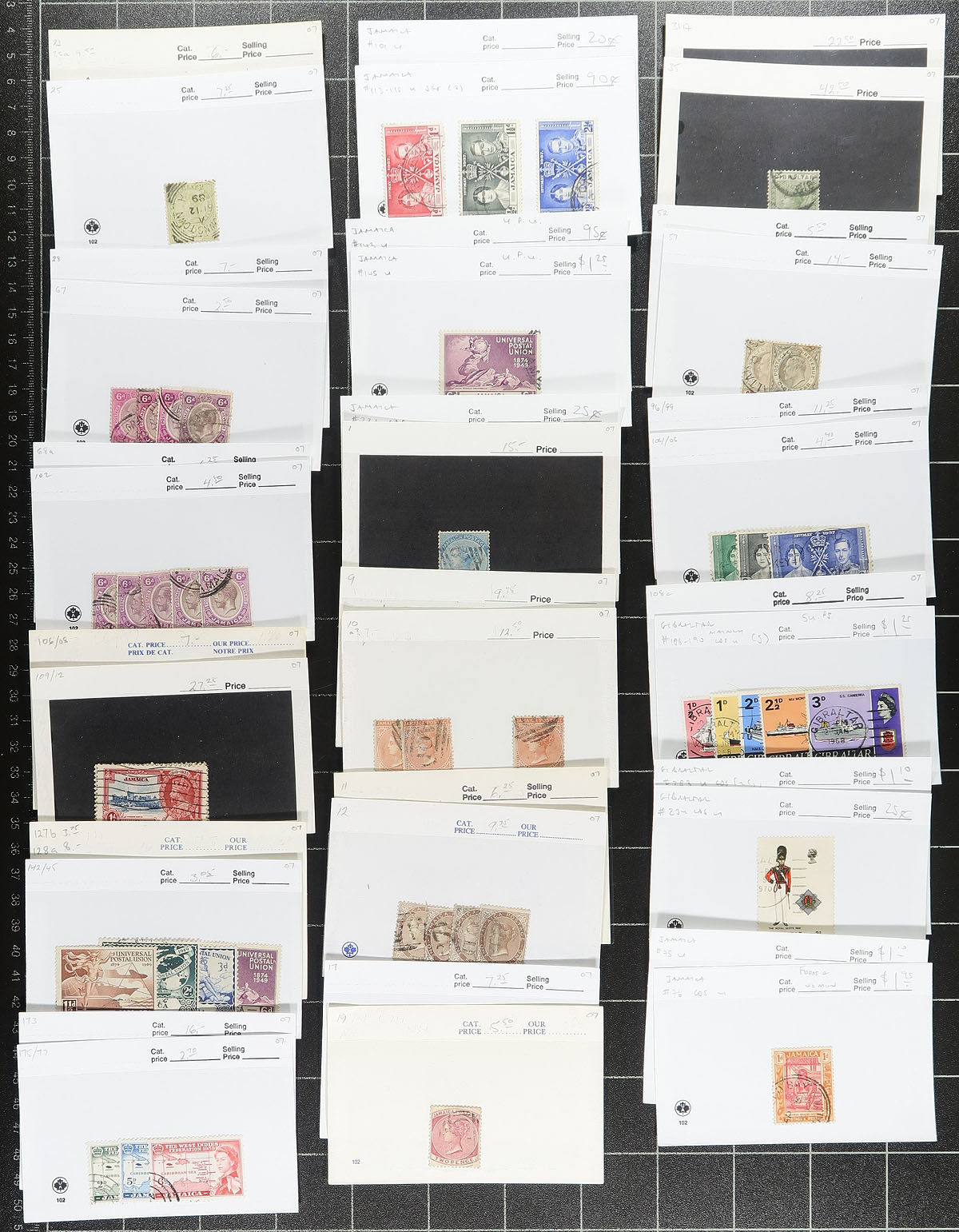 Group of primarily used British Commonwealth stamps in roughly 180 dealer 102 cards, Victorian reign to the 1960's. The lot contains material from F to L countries only, noting better representation from Fiji, Gibraltar, Hong Kong, Jamaica, K.U.T.. with each stamp identified by Scott number with accompanying older catalogue price. Most cards have one stamp per card, along with a few sets, generally cataloging $3 and under, but did note better items cataloguing $5 to $20 and up each. Owner's older Scott value for the lot totals US$1,534.10 ($2,071.00 CDN). A few faults noted, still a nice lot for the British Commonwealth or worldwide collector. Estimate =