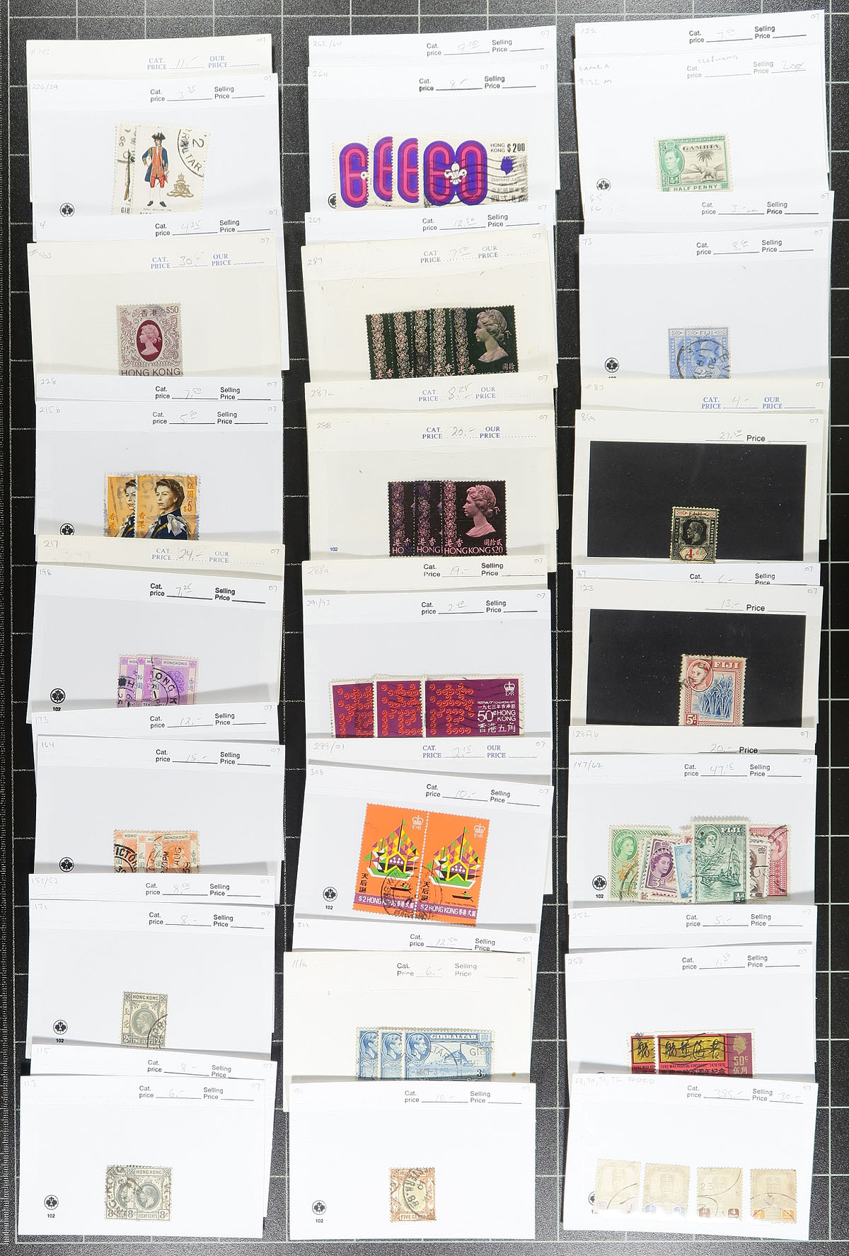 Group of primarily used British Commonwealth stamps in roughly 180 dealer 102 cards, Victorian reign to the 1960's. The lot contains material from F to L countries only, noting better representation from Fiji, Gibraltar, Hong Kong, Jamaica, K.U.T.. with each stamp identified by Scott number with accompanying older catalogue price. Most cards have one stamp per card, along with a few sets, generally cataloging $3 and under, but did note better items cataloguing $5 to $20 and up each. Owner's older Scott value for the lot totals US$1,534.10 ($2,071.00 CDN). A few faults noted, still a nice lot for the British Commonwealth or worldwide collector. Estimate =