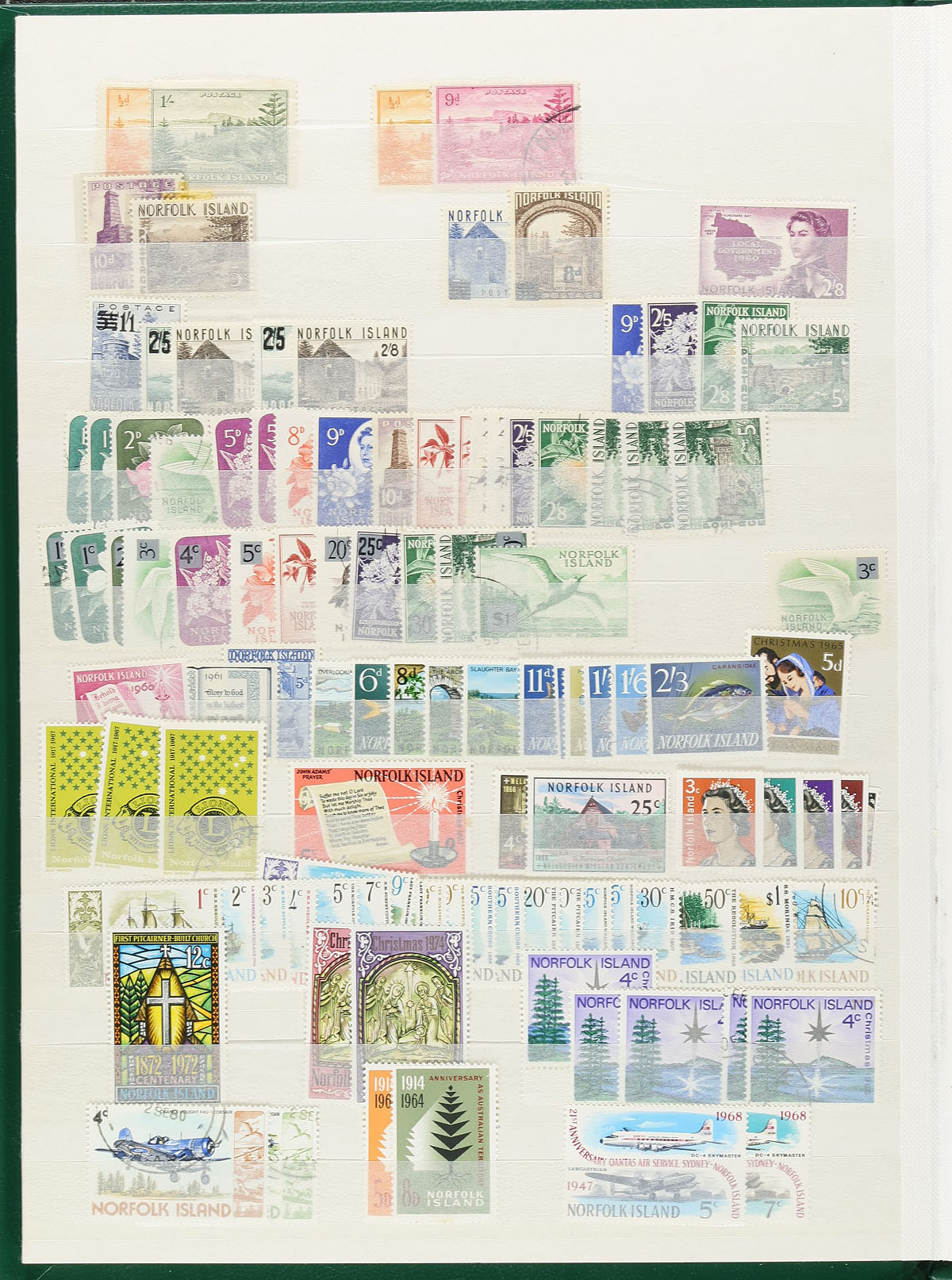 Collection of mint and used British Commonwealth material, containing many hundreds of stamps in a stockbook. We note material from Falkland Islands and Dependencies, South Georgia, and Norfolk Islands, including singles, sets, and a few souvenir sheets. The strength of the lot is with the mint Falkland Islands including Scott #s 15, 58, 60, and 117-120 (c.v. $112.50 total), along with some items cataloguing $5 to $10 throughout the lot. A nice clean grouping ideal for all collectors, with all pages photographed online. Estimate =