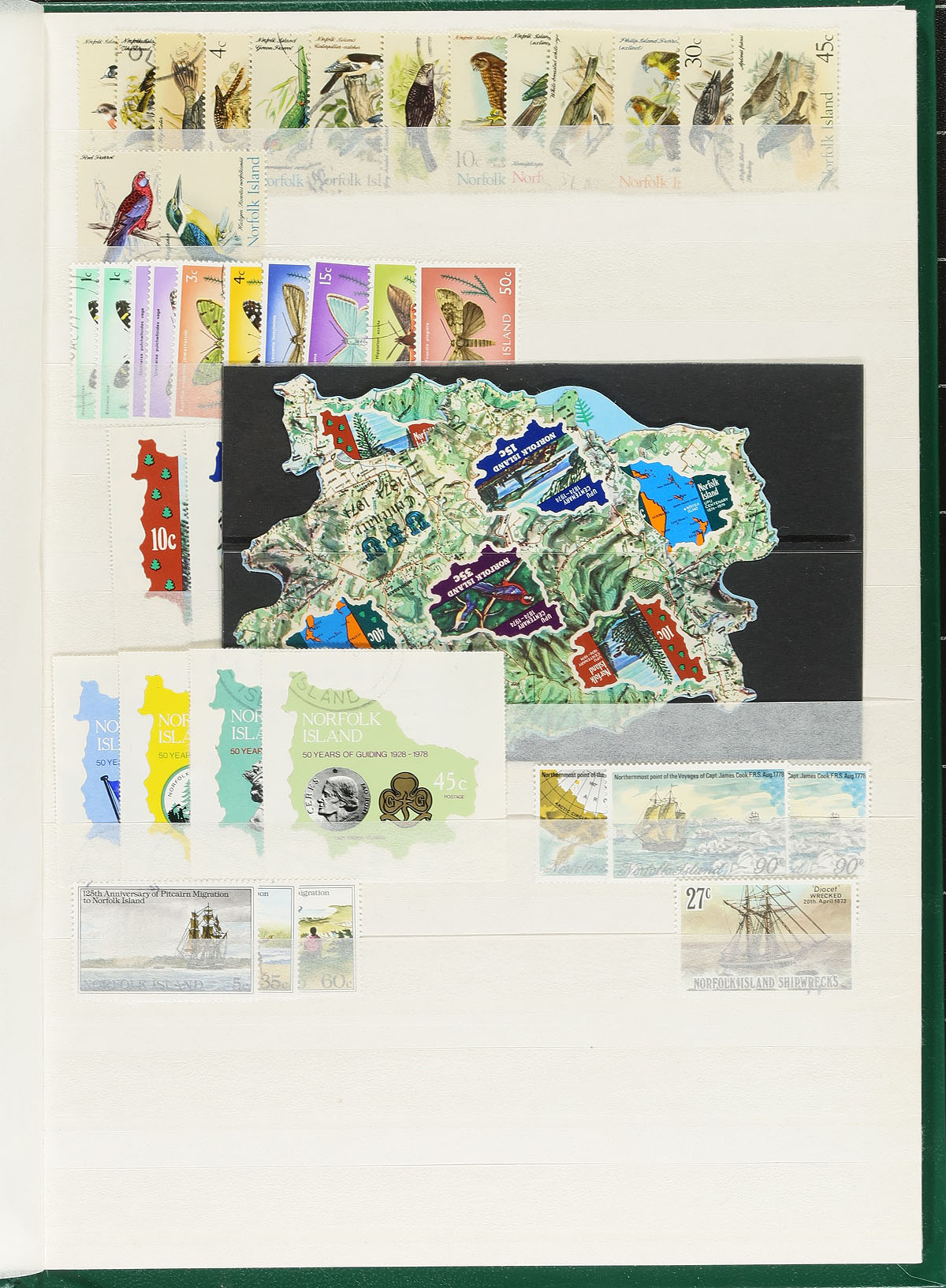 Collection of mint and used British Commonwealth material, containing many hundreds of stamps in a stockbook. We note material from Falkland Islands and Dependencies, South Georgia, and Norfolk Islands, including singles, sets, and a few souvenir sheets. The strength of the lot is with the mint Falkland Islands including Scott #s 15, 58, 60, and 117-120 (c.v. $112.50 total), along with some items cataloguing $5 to $10 throughout the lot. A nice clean grouping ideal for all collectors, with all pages photographed online. Estimate =