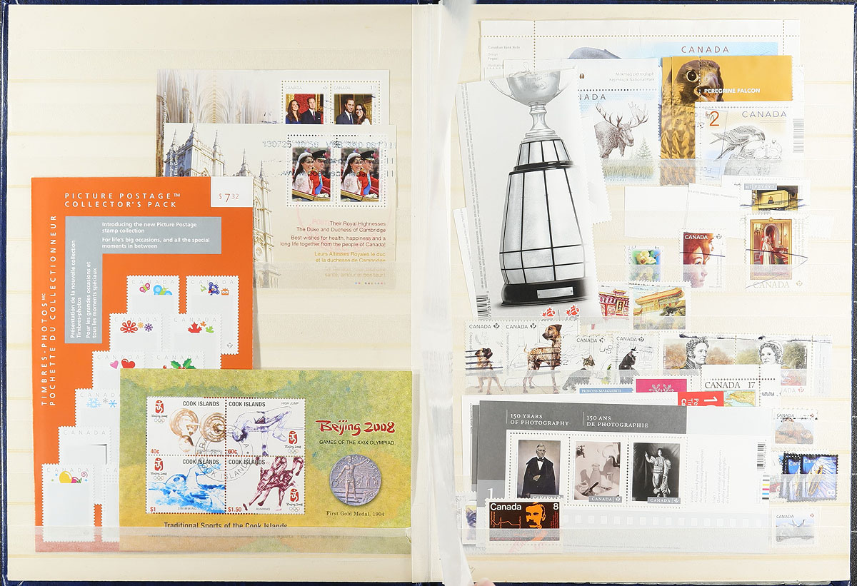Collection of mint and used British Commonwealth issues, containing several hundreds of stamps neatly arranged in 2 stockbooks. We note better representation from Australia, Canada, and Tonga, with a few other regions (including bits of United States), with most of the singles, sets, booklets, and souvenir sheets appearing to be post 1990s issues for Australia and Canada, with more classic material from Tonga. A spot check indicated some material cataloguing $10 and up, with a likely $50 to $70 worth of face value Canada alone. A nice lot for all collectors, with all stamps photographed online. Estimate =