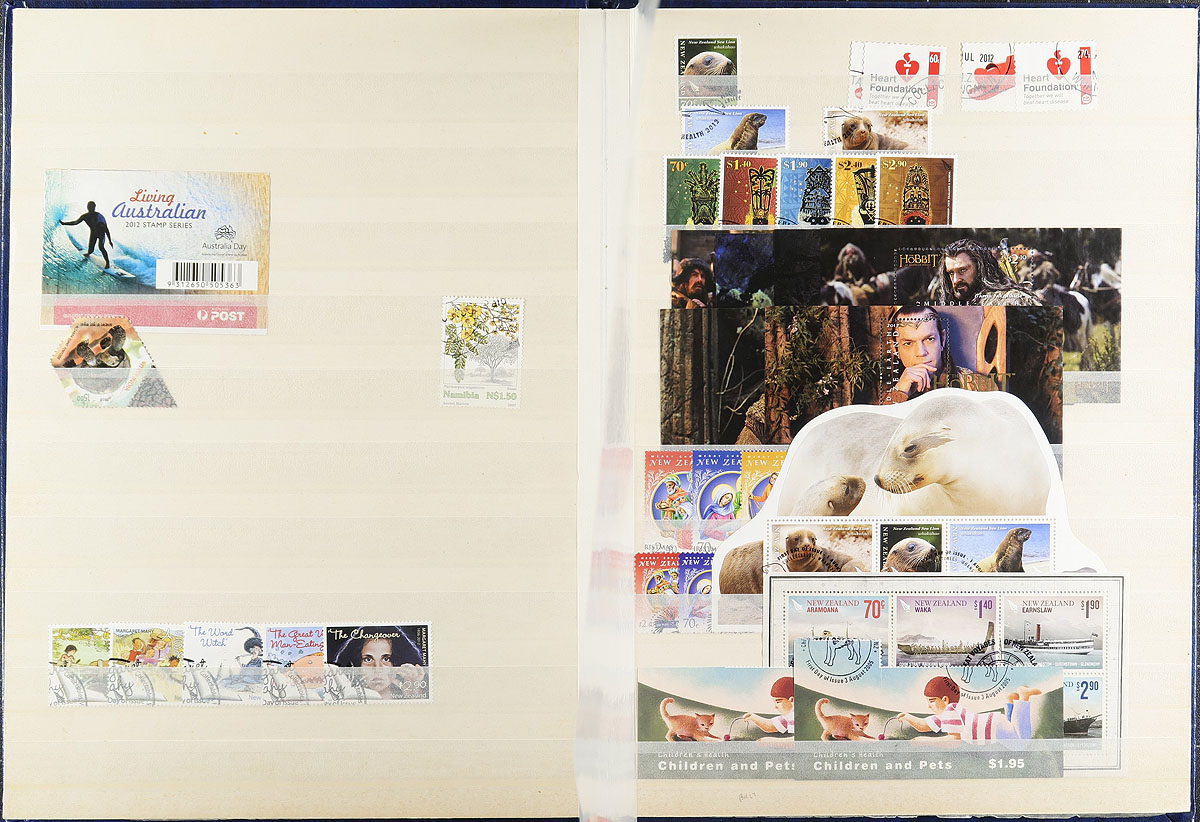 Collection of mint and used British Commonwealth issues, containing several hundreds of stamps neatly arranged in 2 stockbooks. We note better representation from Australia, Canada, and Tonga, with a few other regions (including bits of United States), with most of the singles, sets, booklets, and souvenir sheets appearing to be post 1990s issues for Australia and Canada, with more classic material from Tonga. A spot check indicated some material cataloguing $10 and up, with a likely $50 to $70 worth of face value Canada alone. A nice lot for all collectors, with all stamps photographed online. Estimate =