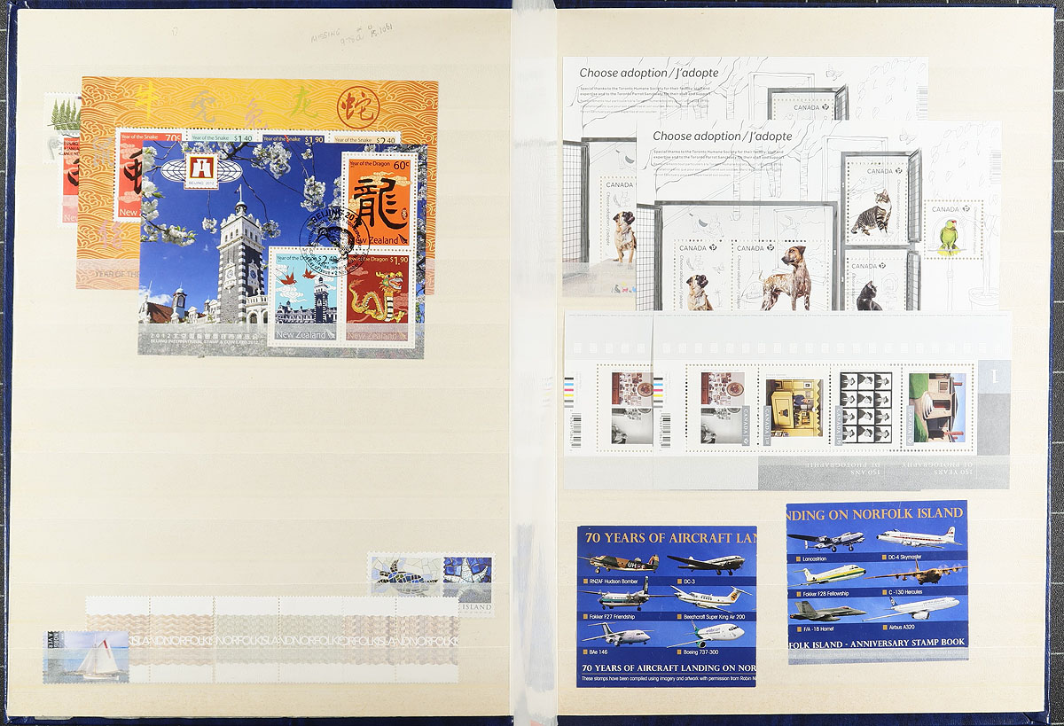 Collection of mint and used British Commonwealth issues, containing several hundreds of stamps neatly arranged in 2 stockbooks. We note better representation from Australia, Canada, and Tonga, with a few other regions (including bits of United States), with most of the singles, sets, booklets, and souvenir sheets appearing to be post 1990s issues for Australia and Canada, with more classic material from Tonga. A spot check indicated some material cataloguing $10 and up, with a likely $50 to $70 worth of face value Canada alone. A nice lot for all collectors, with all stamps photographed online. Estimate =