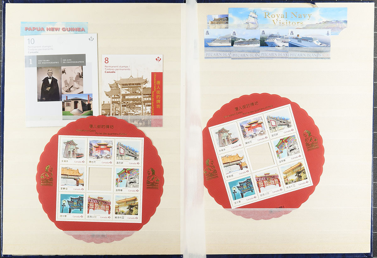 Collection of mint and used British Commonwealth issues, containing several hundreds of stamps neatly arranged in 2 stockbooks. We note better representation from Australia, Canada, and Tonga, with a few other regions (including bits of United States), with most of the singles, sets, booklets, and souvenir sheets appearing to be post 1990s issues for Australia and Canada, with more classic material from Tonga. A spot check indicated some material cataloguing $10 and up, with a likely $50 to $70 worth of face value Canada alone. A nice lot for all collectors, with all stamps photographed online. Estimate =