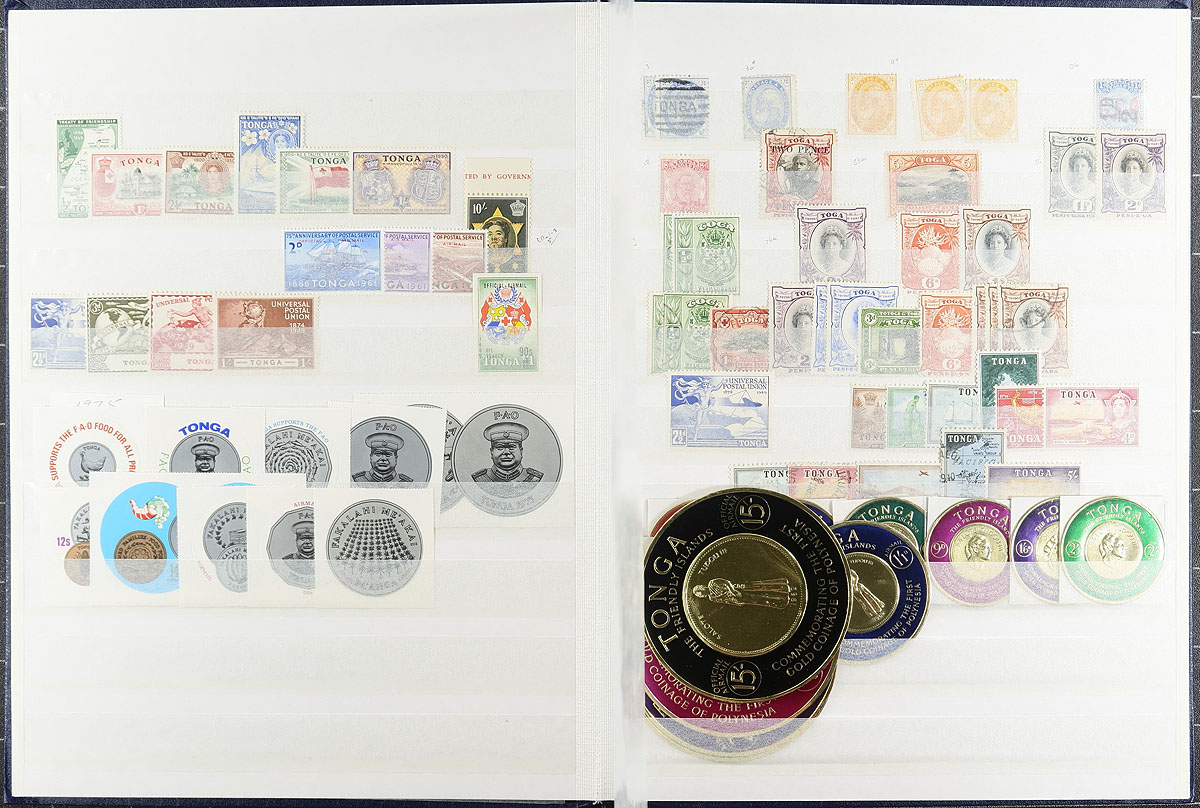 Collection of mint and used British Commonwealth issues, containing several hundreds of stamps neatly arranged in 2 stockbooks. We note better representation from Australia, Canada, and Tonga, with a few other regions (including bits of United States), with most of the singles, sets, booklets, and souvenir sheets appearing to be post 1990s issues for Australia and Canada, with more classic material from Tonga. A spot check indicated some material cataloguing $10 and up, with a likely $50 to $70 worth of face value Canada alone. A nice lot for all collectors, with all stamps photographed online. Estimate =