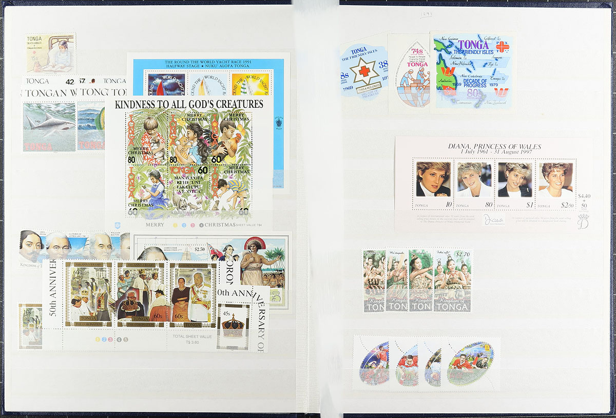 Collection of mint and used British Commonwealth issues, containing several hundreds of stamps neatly arranged in 2 stockbooks. We note better representation from Australia, Canada, and Tonga, with a few other regions (including bits of United States), with most of the singles, sets, booklets, and souvenir sheets appearing to be post 1990s issues for Australia and Canada, with more classic material from Tonga. A spot check indicated some material cataloguing $10 and up, with a likely $50 to $70 worth of face value Canada alone. A nice lot for all collectors, with all stamps photographed online. Estimate =
