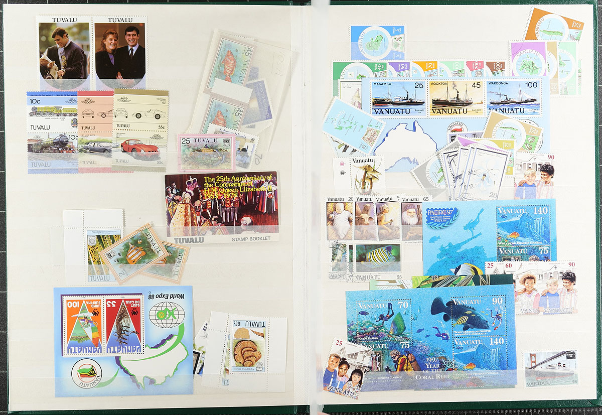 Collection of mint and used British Commonwealth issues, containing several hundreds of stamps neatly arranged in 2 stockbooks. We note representation from New Hebrides, New Guinea, Nauru, Tuvalu, and Vanuata, containing singles sets, and a few souvenir sheets, generally ranging from the 1900s onwards. A spot check indicated some material cataloguing $10 and up including New Hebrides #1 (c.v. $60), 31 ($125). A nice lot for all collectors, especially topical and thematic folks as we encountered several suitable subjects. Overall fine to very fine, with all stamps photographed online. Estimate =