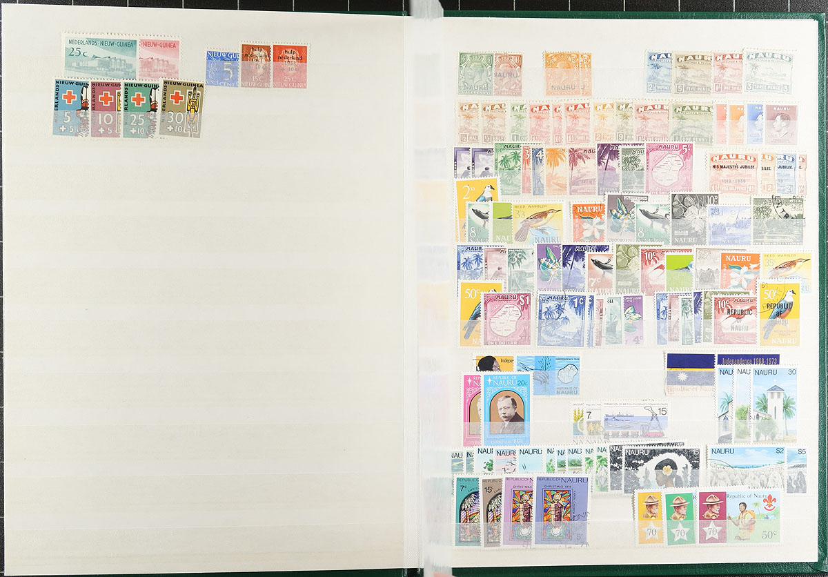 Collection of mint and used British Commonwealth issues, containing several hundreds of stamps neatly arranged in 2 stockbooks. We note representation from New Hebrides, New Guinea, Nauru, Tuvalu, and Vanuata, containing singles sets, and a few souvenir sheets, generally ranging from the 1900s onwards. A spot check indicated some material cataloguing $10 and up including New Hebrides #1 (c.v. $60), 31 ($125). A nice lot for all collectors, especially topical and thematic folks as we encountered several suitable subjects. Overall fine to very fine, with all stamps photographed online. Estimate =
