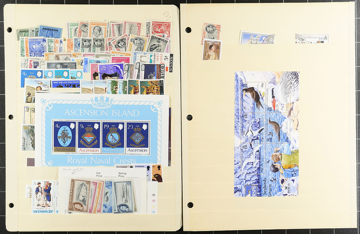 Lovely group of mint and used British Commonwealth material, 1900s-2000s, containing roughly 1,000 stamps in 16 well organized manila stock pages. We note roughly 7 different countries ranging from A to J, including Ascension, British Antarctic Territories, Christmas Island, Australian Antarctic Territory, Barbados, Gilbert and Ellice Islands and Jamaica, containing singles, sets, and souvenir sheets. A spot check indicated singles and sets cataloguing $10 to $30 and up each including Ascension #7 (mint with short perf at bottom), British Antarctic Territory#8-14 (used, $72.30 total), Barbados #216-227 (mh, $81.50 total), just to name a few. A lovely lot for all collectors, with all pages photographed online. Overall fine to very fine. Estimate =