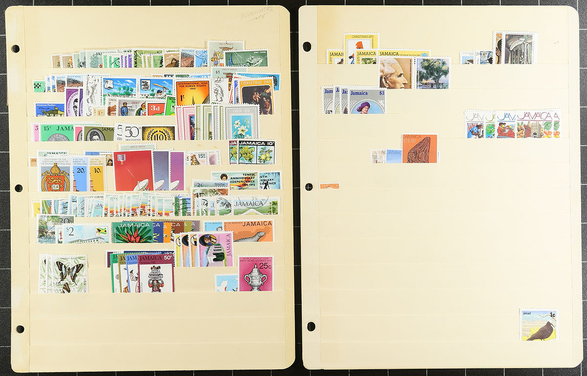 Lovely group of mint and used British Commonwealth material, 1900s-2000s, containing roughly 1,000 stamps in 16 well organized manila stock pages. We note roughly 7 different countries ranging from A to J, including Ascension, British Antarctic Territories, Christmas Island, Australian Antarctic Territory, Barbados, Gilbert and Ellice Islands and Jamaica, containing singles, sets, and souvenir sheets. A spot check indicated singles and sets cataloguing $10 to $30 and up each including Ascension #7 (mint with short perf at bottom), British Antarctic Territory#8-14 (used, $72.30 total), Barbados #216-227 (mh, $81.50 total), just to name a few. A lovely lot for all collectors, with all pages photographed online. Overall fine to very fine. Estimate =