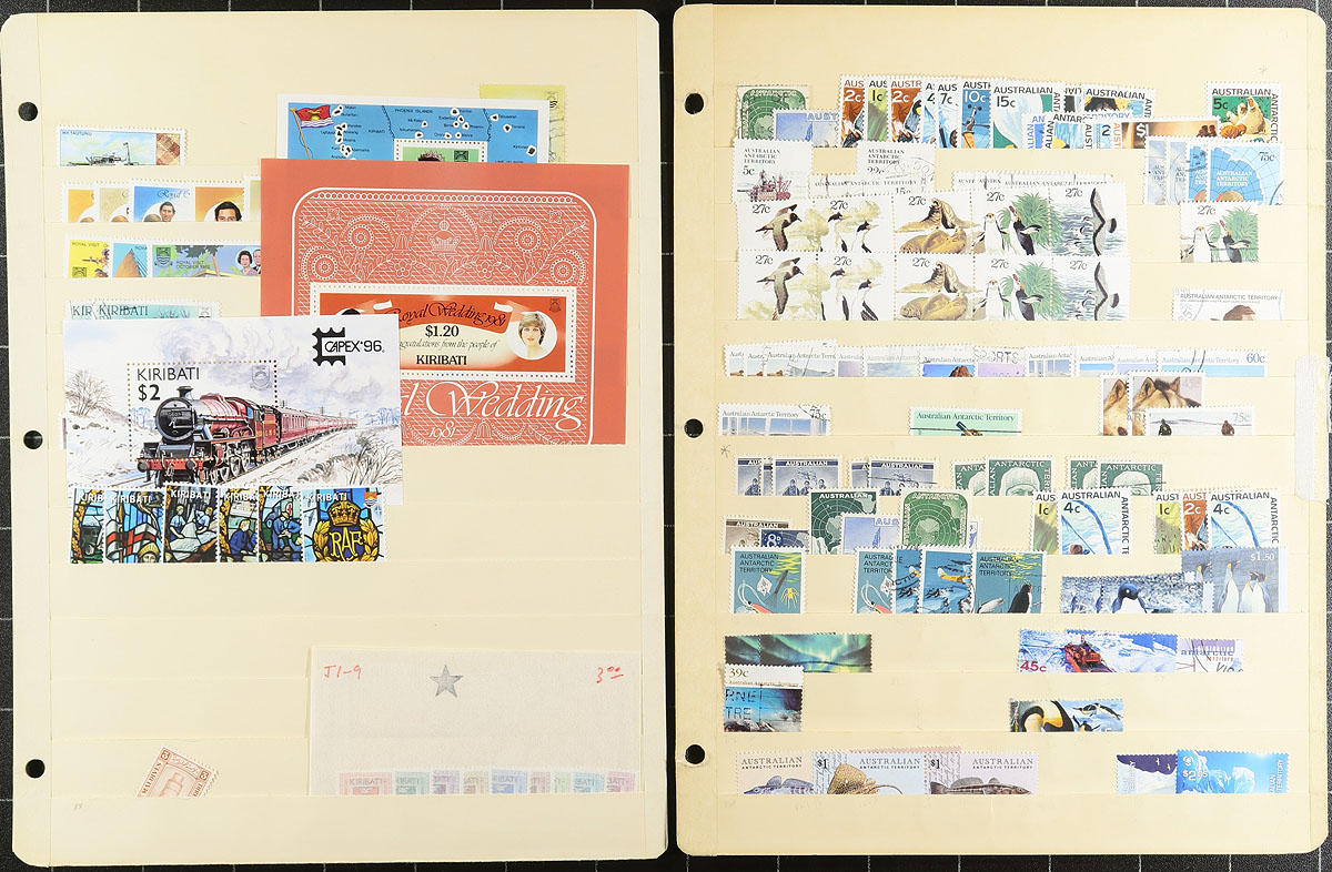 Lovely group of mint and used British Commonwealth material, 1900s-2000s, containing roughly 1,000 stamps in 16 well organized manila stock pages. We note roughly 7 different countries ranging from A to J, including Ascension, British Antarctic Territories, Christmas Island, Australian Antarctic Territory, Barbados, Gilbert and Ellice Islands and Jamaica, containing singles, sets, and souvenir sheets. A spot check indicated singles and sets cataloguing $10 to $30 and up each including Ascension #7 (mint with short perf at bottom), British Antarctic Territory#8-14 (used, $72.30 total), Barbados #216-227 (mh, $81.50 total), just to name a few. A lovely lot for all collectors, with all pages photographed online. Overall fine to very fine. Estimate =