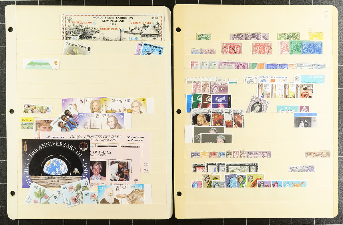 Lovely group of mint and used British Commonwealth material, 1900's-1990's, containing roughly 1,000 stamps in 16 well organized manila stock pages. We note roughly 7 different countries ranging from P to T, including Pitcairn Islands, Samoa, Sarawak, Solomon Islands, Seychelles, St. Helena, and Tristan da Cunha, containing singles, sets, and souvenir sheets. A spot check indicated material cataloguing $10 to $30 and up each including Pitcairn Islands #1-8 (mh, $84.75), along with Omnibus sets and more. A lovely lot for all collectors, with all pages photographed online. Overall fine to very fine. Estimate =