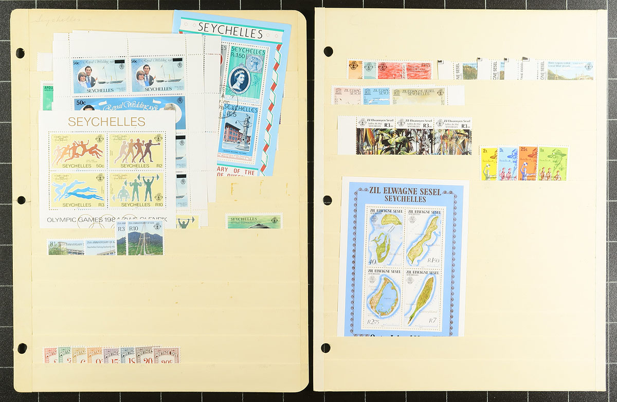 Lovely group of mint and used British Commonwealth material, 1900's-1990's, containing roughly 1,000 stamps in 16 well organized manila stock pages. We note roughly 7 different countries ranging from P to T, including Pitcairn Islands, Samoa, Sarawak, Solomon Islands, Seychelles, St. Helena, and Tristan da Cunha, containing singles, sets, and souvenir sheets. A spot check indicated material cataloguing $10 to $30 and up each including Pitcairn Islands #1-8 (mh, $84.75), along with Omnibus sets and more. A lovely lot for all collectors, with all pages photographed online. Overall fine to very fine. Estimate =