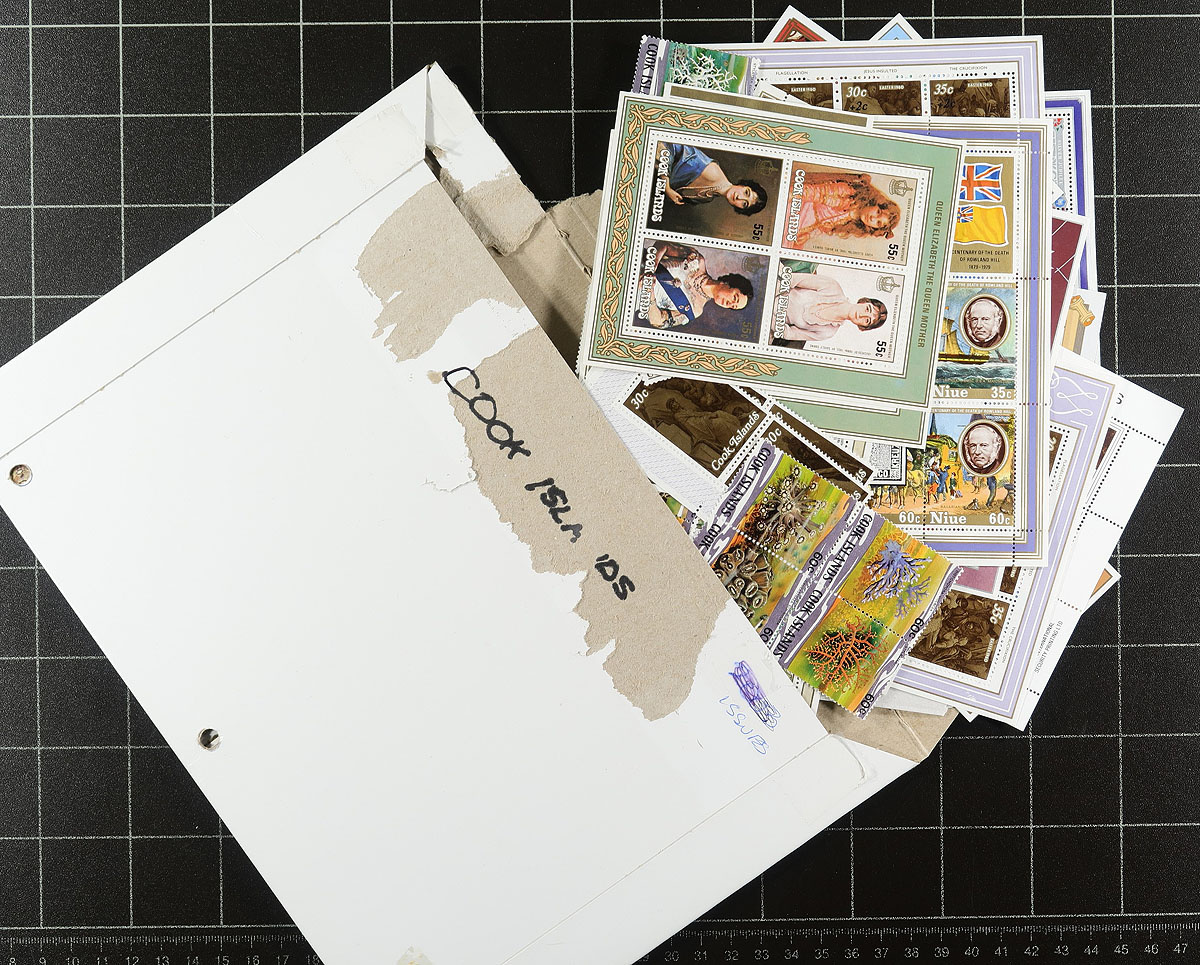 Consignment remainders of mint and used British Commonwealth material, containing many hundreds of items in a variety of formats. A spot check indicated mostly representation from Pacific or West Indies areas notably Cook Islands, Niue, Aitutaki, Penrhyn, just to name a few. The lot appears to contain material from the 1960's to the 1980's noting singles, sets, and several souvenir sheets, in a few stockbooks, and loose material in folders. We estimate several items in the $3 to $5 range, and encountered several suitable subjects for topical and thematic collectors, and should be worth our reasonable estimate. Estimate =