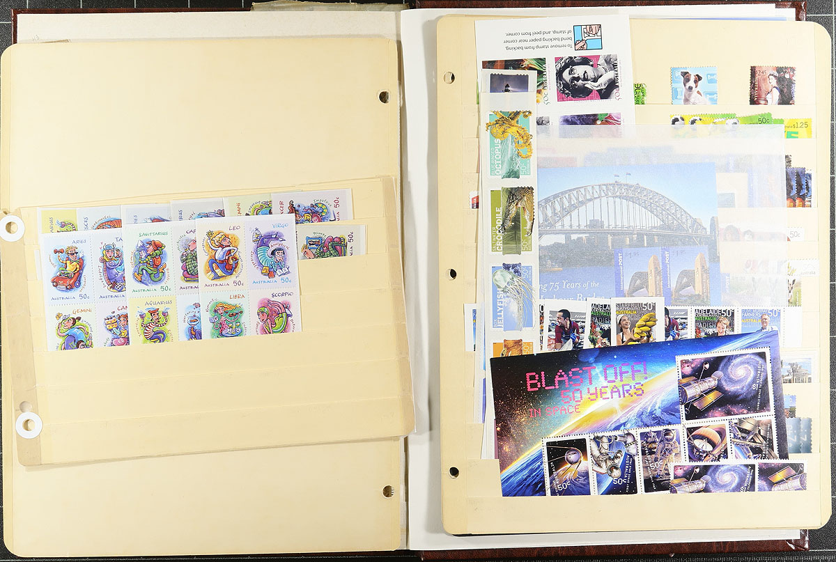 Nice collection of mint and used Australia, 1913-2012, containing many hundreds of stamps neatly arranged in a stockbook and a few manila stock pages. The lot generally ranges from Scott #1/3708, containing singles, sets, and a few souvenir sheets and sheetlets. The collection begins with a few used Kangaroos and a selection of KGV Heads, and continues with a mix of mint and or used issues including #s 127 (used), 178 (mh, x2), 179 (used, $85 total), 218-221 (mh, $253 total), along with singles and sets cataloguing $10 to $20 and up each. The modern mint is primarily never hinged and we estimate face value to be in the $200 to $300 range. A nice lot for the Australia or British Commonwealth collector with all pages photographed online. Estimate =