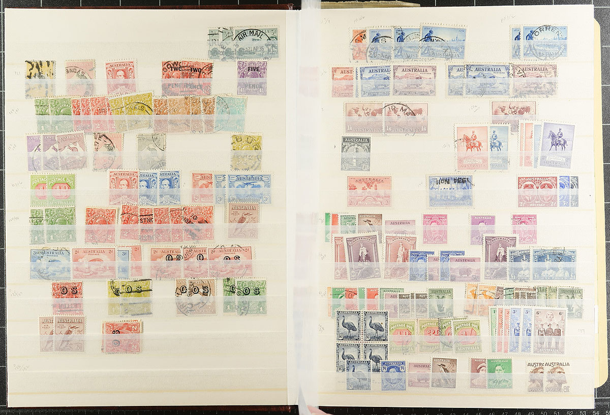 Nice collection of mint and used Australia, 1913-2012, containing many hundreds of stamps neatly arranged in a stockbook and a few manila stock pages. The lot generally ranges from Scott #1/3708, containing singles, sets, and a few souvenir sheets and sheetlets. The collection begins with a few used Kangaroos and a selection of KGV Heads, and continues with a mix of mint and or used issues including #s 127 (used), 178 (mh, x2), 179 (used, $85 total), 218-221 (mh, $253 total), along with singles and sets cataloguing $10 to $20 and up each. The modern mint is primarily never hinged and we estimate face value to be in the $200 to $300 range. A nice lot for the Australia or British Commonwealth collector with all pages photographed online. Estimate =