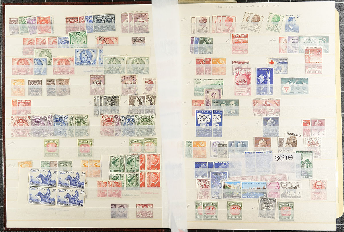 Nice collection of mint and used Australia, 1913-2012, containing many hundreds of stamps neatly arranged in a stockbook and a few manila stock pages. The lot generally ranges from Scott #1/3708, containing singles, sets, and a few souvenir sheets and sheetlets. The collection begins with a few used Kangaroos and a selection of KGV Heads, and continues with a mix of mint and or used issues including #s 127 (used), 178 (mh, x2), 179 (used, $85 total), 218-221 (mh, $253 total), along with singles and sets cataloguing $10 to $20 and up each. The modern mint is primarily never hinged and we estimate face value to be in the $200 to $300 range. A nice lot for the Australia or British Commonwealth collector with all pages photographed online. Estimate =