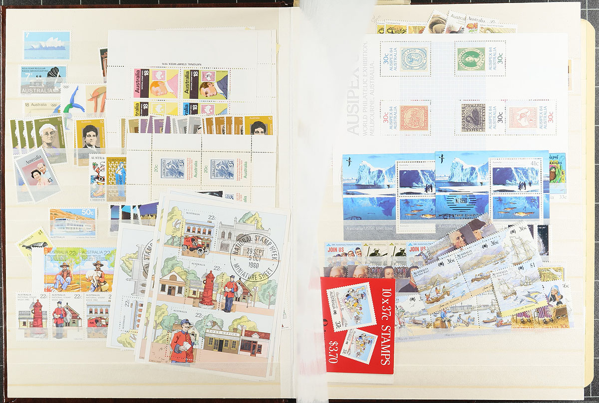 Nice collection of mint and used Australia, 1913-2012, containing many hundreds of stamps neatly arranged in a stockbook and a few manila stock pages. The lot generally ranges from Scott #1/3708, containing singles, sets, and a few souvenir sheets and sheetlets. The collection begins with a few used Kangaroos and a selection of KGV Heads, and continues with a mix of mint and or used issues including #s 127 (used), 178 (mh, x2), 179 (used, $85 total), 218-221 (mh, $253 total), along with singles and sets cataloguing $10 to $20 and up each. The modern mint is primarily never hinged and we estimate face value to be in the $200 to $300 range. A nice lot for the Australia or British Commonwealth collector with all pages photographed online. Estimate =