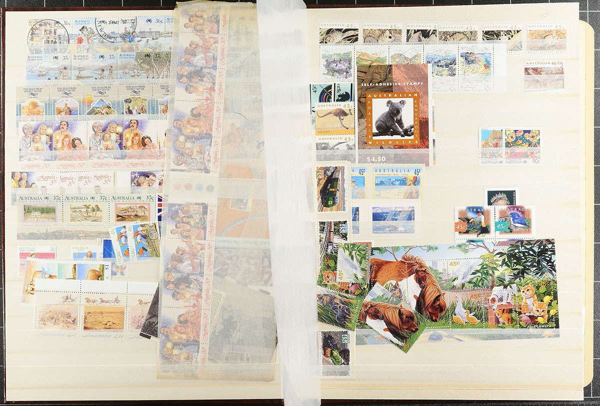 Nice collection of mint and used Australia, 1913-2012, containing many hundreds of stamps neatly arranged in a stockbook and a few manila stock pages. The lot generally ranges from Scott #1/3708, containing singles, sets, and a few souvenir sheets and sheetlets. The collection begins with a few used Kangaroos and a selection of KGV Heads, and continues with a mix of mint and or used issues including #s 127 (used), 178 (mh, x2), 179 (used, $85 total), 218-221 (mh, $253 total), along with singles and sets cataloguing $10 to $20 and up each. The modern mint is primarily never hinged and we estimate face value to be in the $200 to $300 range. A nice lot for the Australia or British Commonwealth collector with all pages photographed online. Estimate =