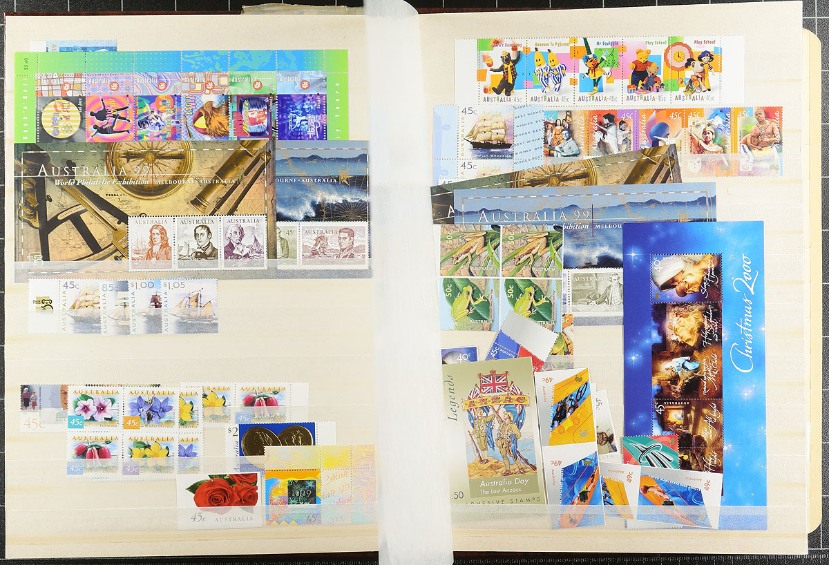 Nice collection of mint and used Australia, 1913-2012, containing many hundreds of stamps neatly arranged in a stockbook and a few manila stock pages. The lot generally ranges from Scott #1/3708, containing singles, sets, and a few souvenir sheets and sheetlets. The collection begins with a few used Kangaroos and a selection of KGV Heads, and continues with a mix of mint and or used issues including #s 127 (used), 178 (mh, x2), 179 (used, $85 total), 218-221 (mh, $253 total), along with singles and sets cataloguing $10 to $20 and up each. The modern mint is primarily never hinged and we estimate face value to be in the $200 to $300 range. A nice lot for the Australia or British Commonwealth collector with all pages photographed online. Estimate =