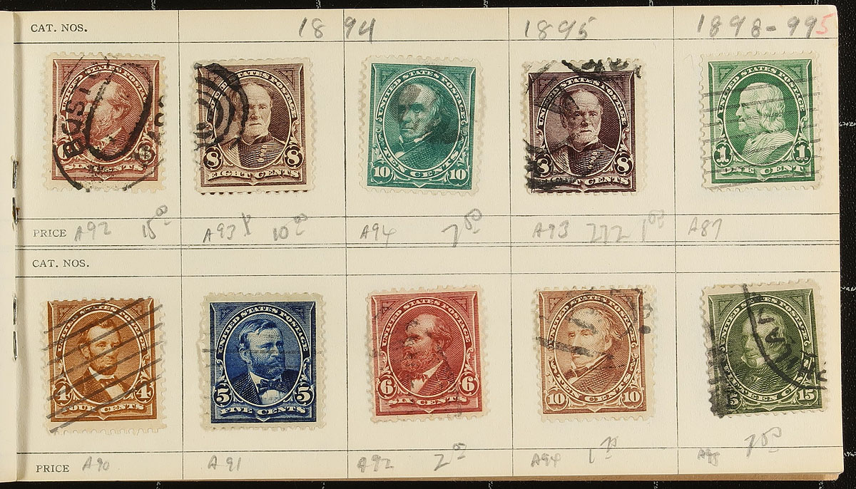 Accumulation of primarily used United States, 1857-1940's, containing many hundreds of stamps in a variety of formats. The lot generally ranges from Scott #26/953, containing singles, sets, and several back of the book issues. The lot includes roughly 50 dealer 102 cards, containing mostly issues from the 1880s to the 1920s, with some cards priced from $3 to $10 each. The lot also includes stock pages of material, notably back of the book issues and revenue issues, along with a mint collection ranging from 1922 to 1949. An eclectic lot with some better values inside, leaving better finds to the dedicated collector, overall fine to very fine. Estimate =