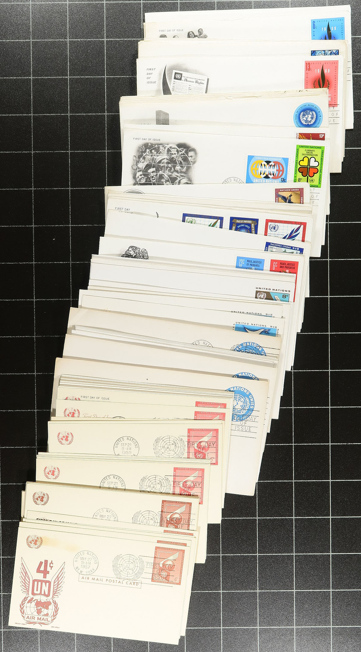 Accumulation of roughly 600 United Nations covers filling a bankers box, 1960's-1980's, with the majority of material being first day covers, along with used and used postal stationery and cards. The majority of material is loose in the box, along with a few cover albums, with material appearing to be from all 3 offices. A good lot for worldwide cover collectors, and topical or thematic collectors, overall fine to very fine. Estimate =
