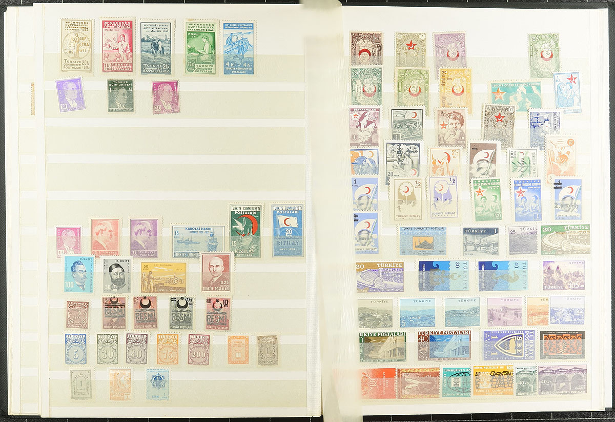 A mish-mash of philatelic fun "balance of consignment" group which includes a Scott brand British Oceania album (partially filled, hit or miss in sections), Algerian on manila stockpages in binder, Saar issues in 32-page Unisafe stockbook, Turkey in 22-page "Alligator" stockbook and 3x dealer "counter book" (3-ring binders) with a heavily duplicated stock. Estimate =