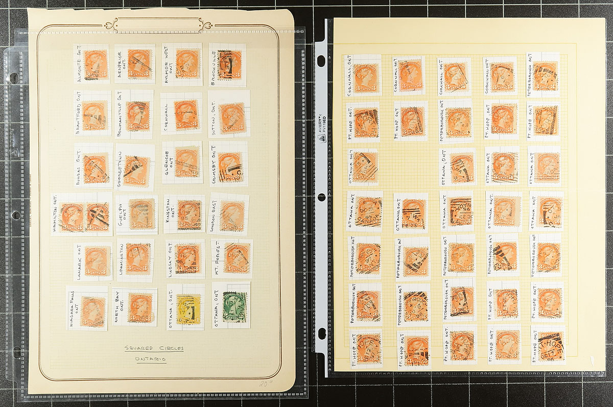 Lovely collection of 3c Small Queens collected for postmarks, containing 363 stamps in totals on well organized pages. The lot starts with the beginnings of a calendar collection containing 228 stamps all with dated cancels, ranging from January 1893 to February 1898. The collection continues with 135 stamps identified for town postmarks, including 107 having squared circles cancels. A lovely specialized lot that should prove popular with postmark collectors, noting several 'sock on the nose' town cancels, overall fine to very fine. Estimate =