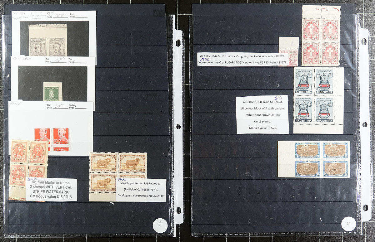Nice grouping of Argentina material, 1920's-1940's, containing stamps and covers in 17 stock pages. There is a lot of interesting material here including singles, blocks, officials, varieties, along with several covers including airmail, first day covers, maximum cards, and likely more. Almost all the stamps and some of the covers have been identified along with accompanying retail values, generally ranging from $5 to $20 and up each. A really interesting lot for the worldwide collector or specialist, overall fine to very fine. Estimate =