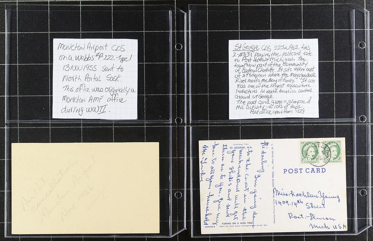 New Brunswick Postal History. A collector's well described and annotated collection of 64x QEII era covers / postcards, with emphasis on postmarks. Take a good look the scans to appreciate the scope of the lot. Estimate =