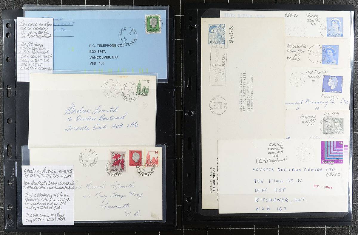New Brunswick Postal History. A collector's well described and annotated collection of 64x QEII era covers / postcards, with emphasis on postmarks. Take a good look the scans to appreciate the scope of the lot. Estimate =