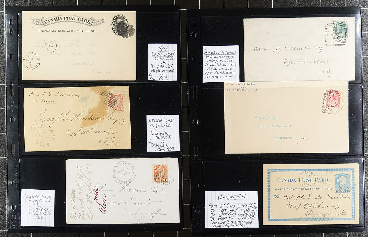 New Brunswick Postal History. A collector's well described and annotated collection of 45x Queen Victoria era covers / postcards. A wonderful holding, with the quality of material being well above average (both in condition, and quality of postmark). Noted Registered, Squared Circles (including Precursor), Fancy Cancels, Postal Stationery and more! Estimate =