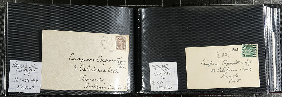 New Brunswick Postal History. A lovely collection of 91x George V / George VI covers, neatly arranged in a like-new Lighthouse brand cover album. Primarily split ring postmarks, but we did note the odd duplex cancels. Quality of strikes is well above-average. Estimate =