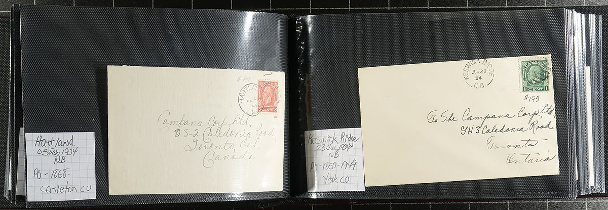New Brunswick Postal History. A lovely collection of 91x George V / George VI covers, neatly arranged in a like-new Lighthouse brand cover album. Primarily split ring postmarks, but we did note the odd duplex cancels. Quality of strikes is well above-average. Estimate =