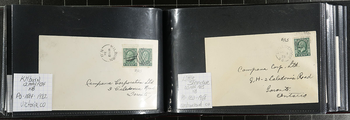 New Brunswick Postal History. A lovely collection of 91x George V / George VI covers, neatly arranged in a like-new Lighthouse brand cover album. Primarily split ring postmarks, but we did note the odd duplex cancels. Quality of strikes is well above-average. Estimate =