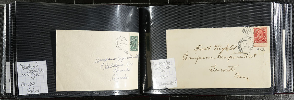 New Brunswick Postal History. A lovely collection of 91x George V / George VI covers, neatly arranged in a like-new Lighthouse brand cover album. Primarily split ring postmarks, but we did note the odd duplex cancels. Quality of strikes is well above-average. Estimate =