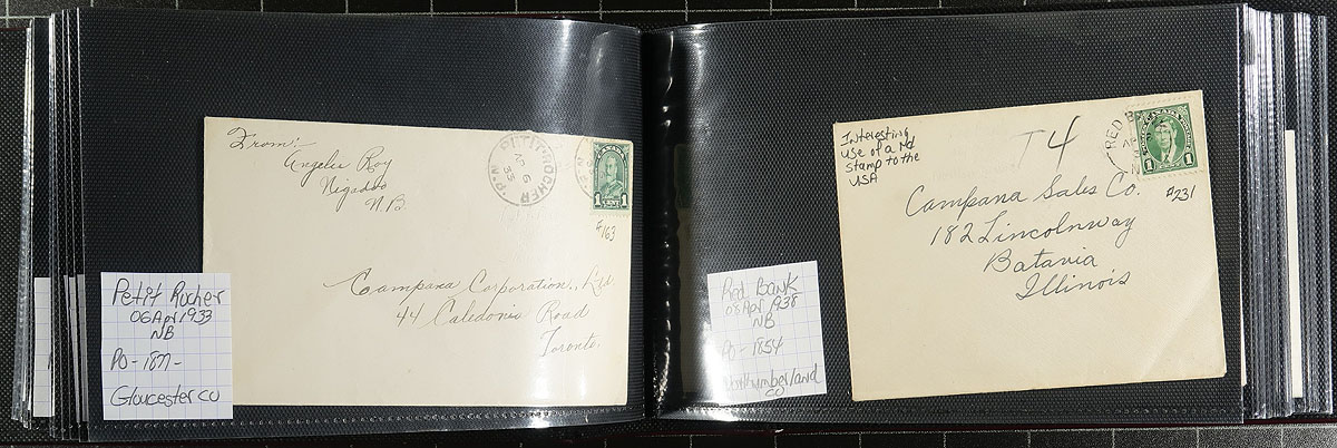 New Brunswick Postal History. A lovely collection of 91x George V / George VI covers, neatly arranged in a like-new Lighthouse brand cover album. Primarily split ring postmarks, but we did note the odd duplex cancels. Quality of strikes is well above-average. Estimate =