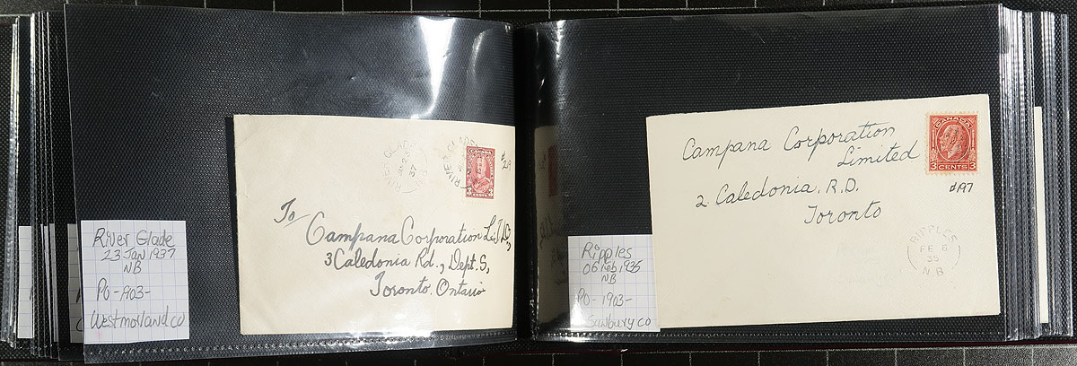 New Brunswick Postal History. A lovely collection of 91x George V / George VI covers, neatly arranged in a like-new Lighthouse brand cover album. Primarily split ring postmarks, but we did note the odd duplex cancels. Quality of strikes is well above-average. Estimate =