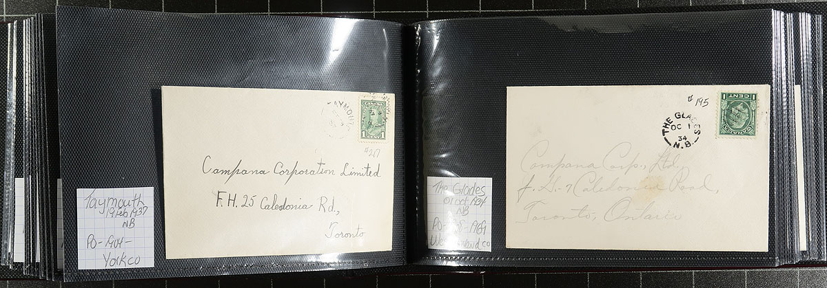 New Brunswick Postal History. A lovely collection of 91x George V / George VI covers, neatly arranged in a like-new Lighthouse brand cover album. Primarily split ring postmarks, but we did note the odd duplex cancels. Quality of strikes is well above-average. Estimate =
