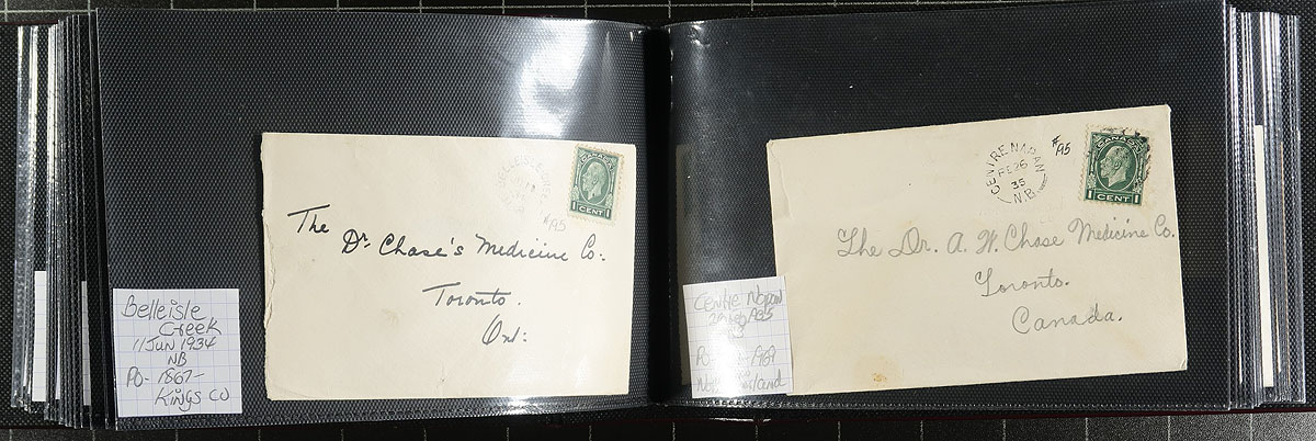 New Brunswick Postal History. A lovely collection of 91x George V / George VI covers, neatly arranged in a like-new Lighthouse brand cover album. Primarily split ring postmarks, but we did note the odd duplex cancels. Quality of strikes is well above-average. Estimate =