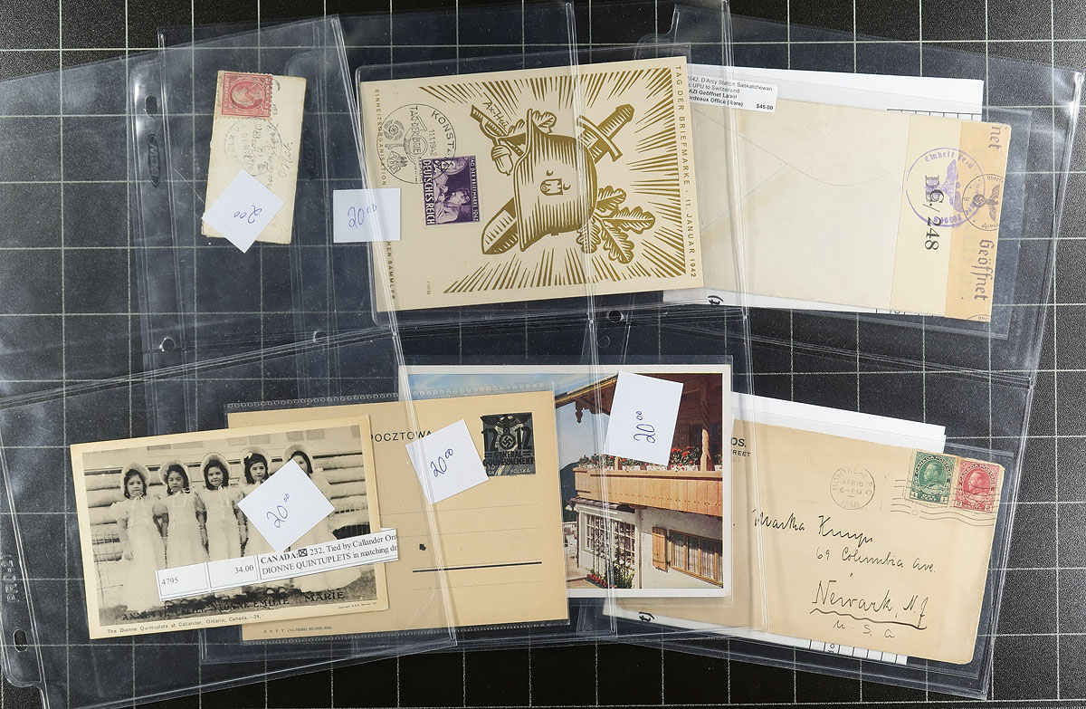 A group of Canada and Worldwide Covers, with roughly 200 primarily Canada covers, 1890's-1970's, neatly organized in 3 volumes. We note a wide variety of items including a few stampless and Small Queen covers, military mail (including various censor tapes and field post offices), first day covers, first flight covers, postcards, and more, with the roughly 40 worldwide covers containing the same type of material. Many of the items have been identified and priced (either retail or catalogue value), ranging from $5 to $20 and up each. A nice lot for cover collectors and dealers alike, overall fine to very fine. Estimate =